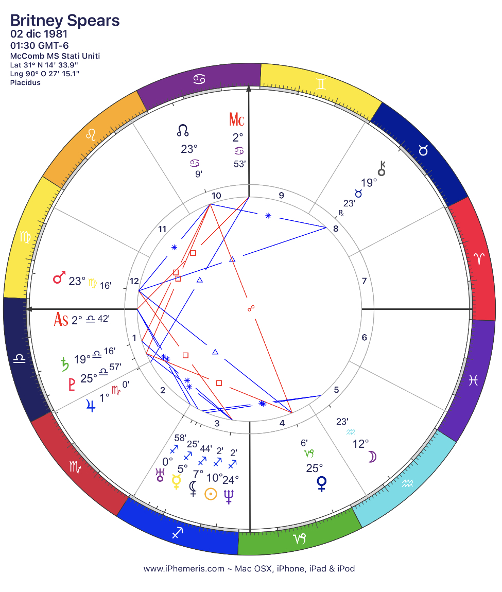 Britney Spears nasce il 2 Dicembre 1981, a McCombs, un paesino della Luisiana, all’1:30 di notte. È una Sagittario con uno stellium di fuoco importantissimo (Urano, Mercurio, Sole e Nettuno) nella Terza Casa natale (il movimento, i media, l’adolescenza). All’ascendente, il segno della Bilancia (e qui Venere diventa davvero importante!) e infine una sfuggente, fredda e non convenzionale Luna nel segno dell’Acquario e in Quinta Casa (la fama, il lusso, i figli, la creatività). Il Medio Cielo, ossia la cuspide che determina la carriera e il successo, è ai primi gradi del dolce segno del Cancro: e non è stata forse proprio la sua dolcezza degli esordi a farcela entrare subito nel cuore, indipendentemente dai nostri gusti musicali? Tra l’altro è bello notare come proprio quello stesso Medio Cielo sia ben sostenuto da un trigono stretto di Giove in Scorpione. Un Giove che, per quanto non si trovi in un segno a lui congeniale, facendo capolino alle porte della sua Seconda Casa (la voce, il denaro, la casa) aveva già scritto a modo suo nelle stelle della vita di Britney che proprio con il canto si sarebbe costruita una carriera benedetta dalla fortuna! Se poi ci andiamo ad aggiungere quel complicato Nodo Nord in Decima Casa, non c’è altro da aggiungere: diventare una popstar era il suo destino!
